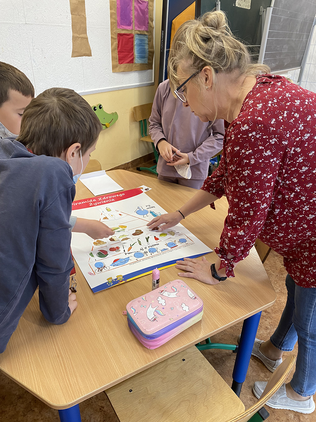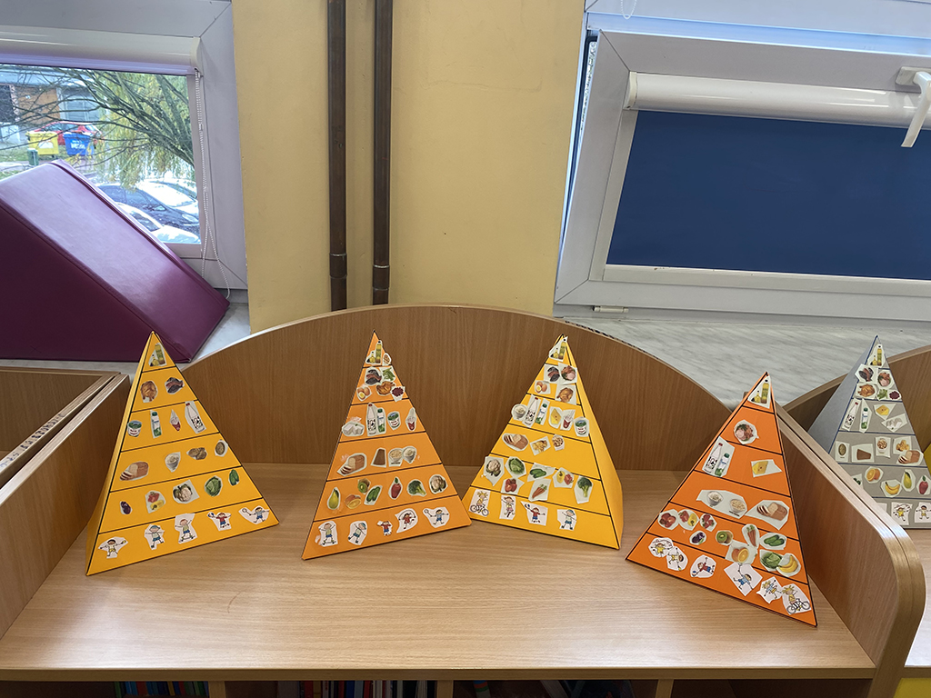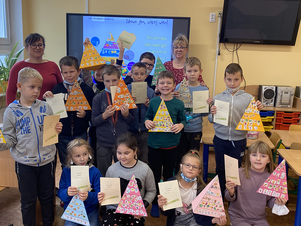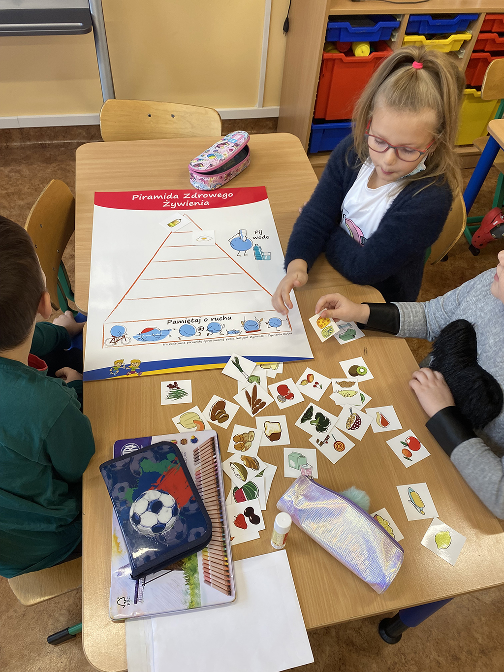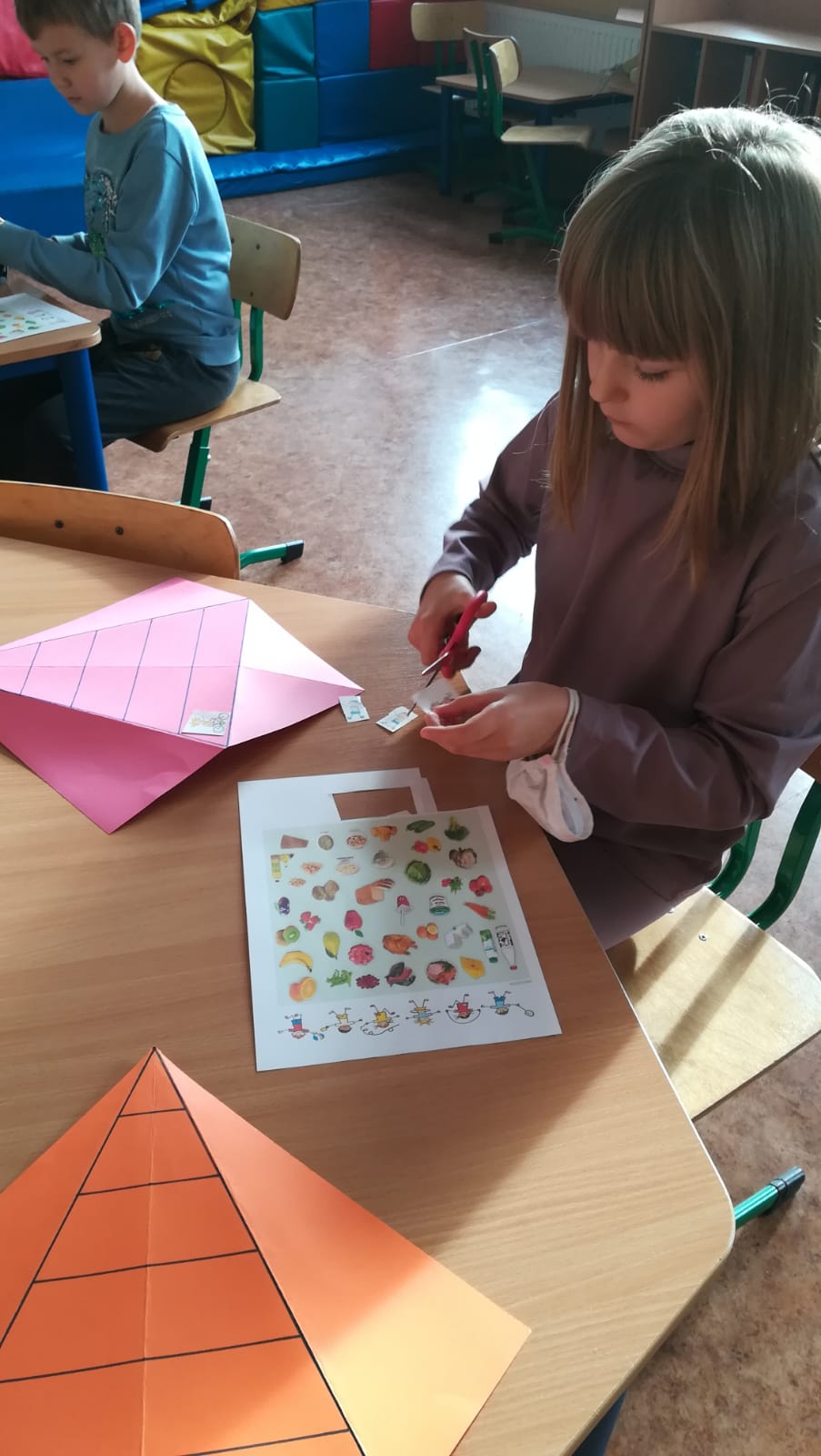 Dużo radości sprawiło dzieciom wykonanie własnej piramidy zdrowia, którą mogły zabrać do domu. Zostały również poproszone o to, aby wspólnie z rodzicami ją obejrzeć, przeanalizować i zastanowić się jakie nowe, zdrowe artykuły spożywcze włączyć do domowego jadłospisu. Ponadto każdy uczestnik projektu otrzymał „Karty posiłków”, w których codziennie przez tydzień będzie notował, co jadł w ciągu całego dnia. Mamy nadzieję, że zdobytą wiedzę uczniowie wykorzystają do