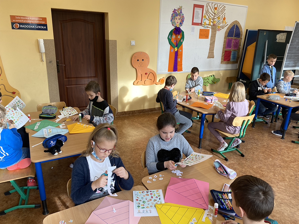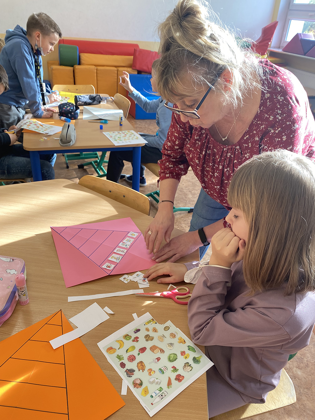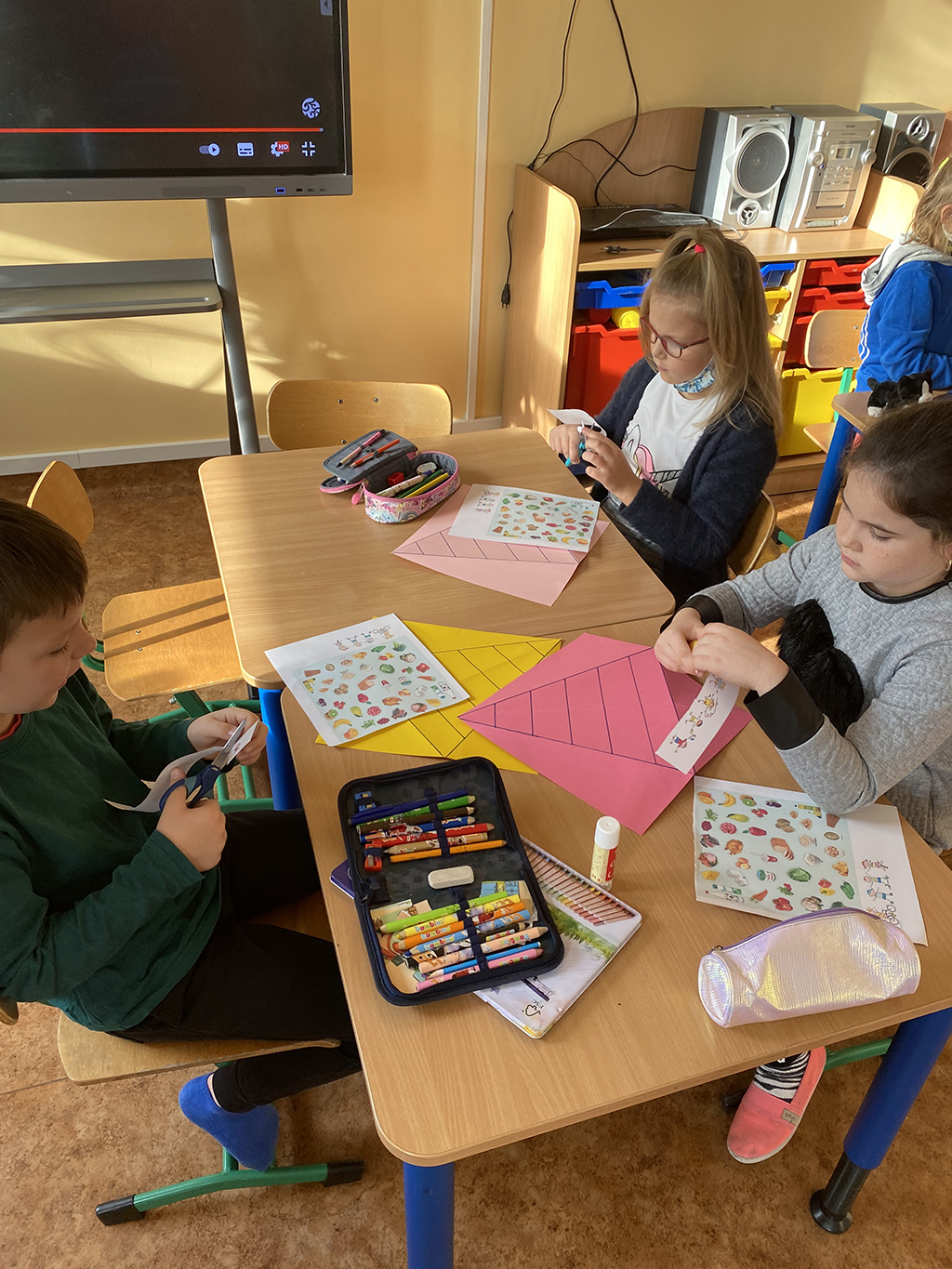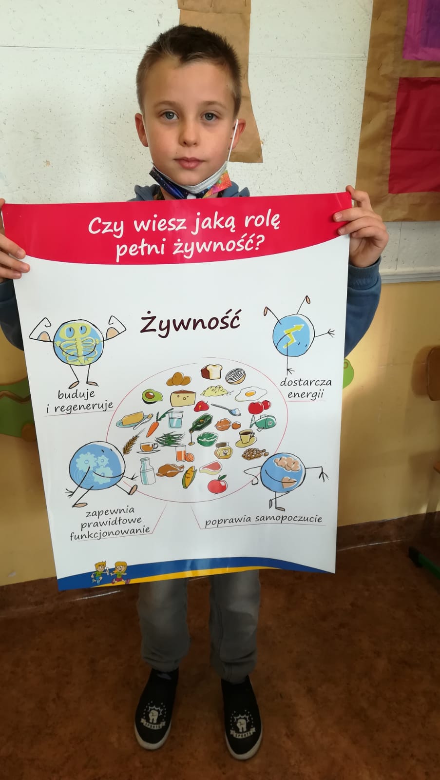Dużo radości sprawiło dzieciom wykonanie własnej piramidy zdrowia, którą mogły zabrać do domu. Zostały również poproszone o to, aby wspólnie z rodzicami ją obejrzeć, przeanalizować i zastanowić się jakie nowe, zdrowe artykuły spożywcze włączyć do domowego jadłospisu. Ponadto każdy uczestnik projektu otrzymał „Karty posiłków”, w których codziennie przez tydzień będzie notował, co jadł w ciągu całego dnia. Mamy nadzieję, że zdobytą wiedzę uczniowie wykorzystają do