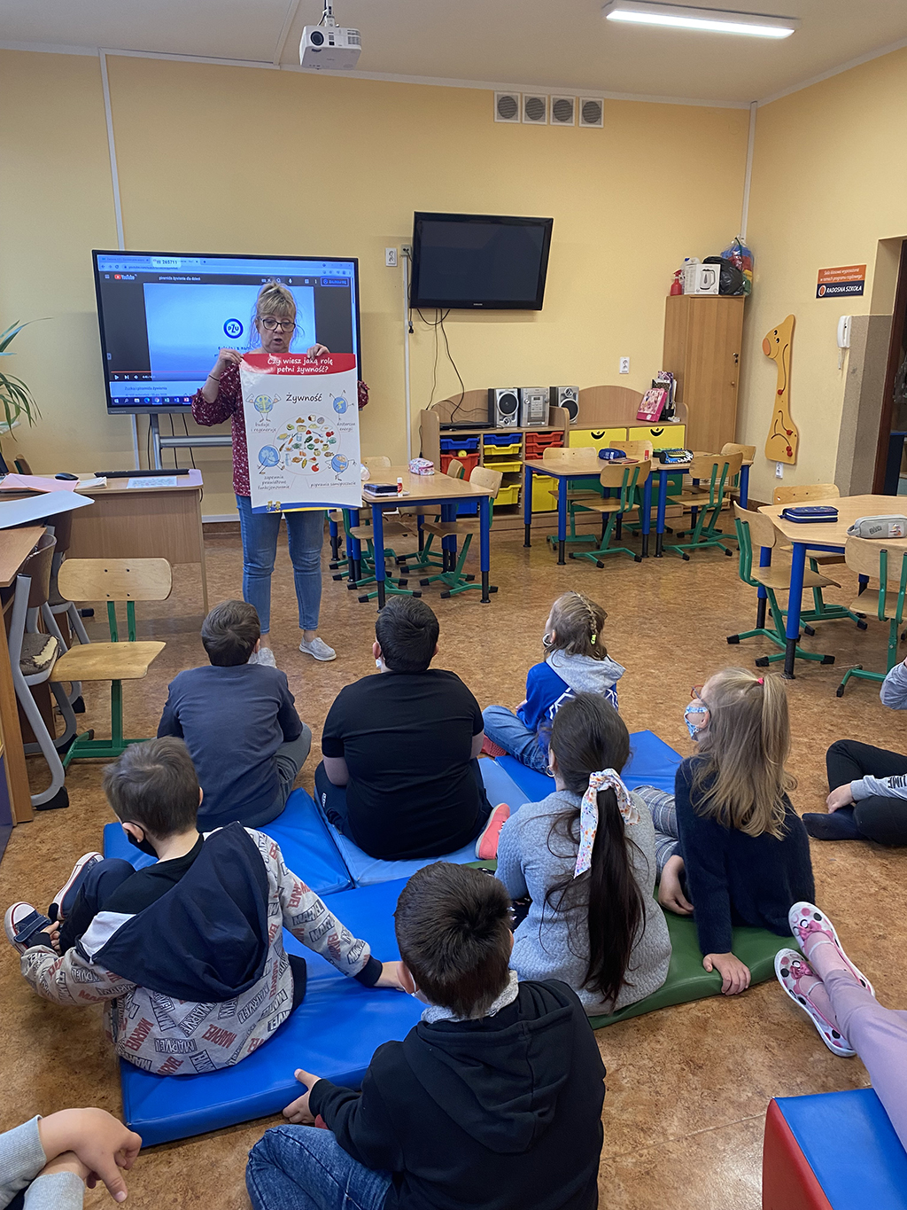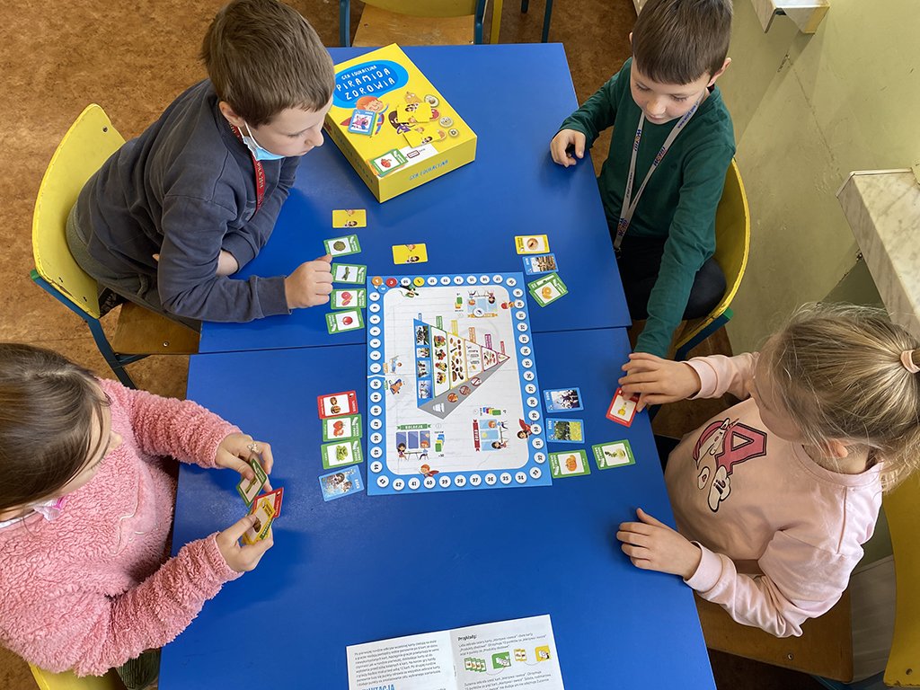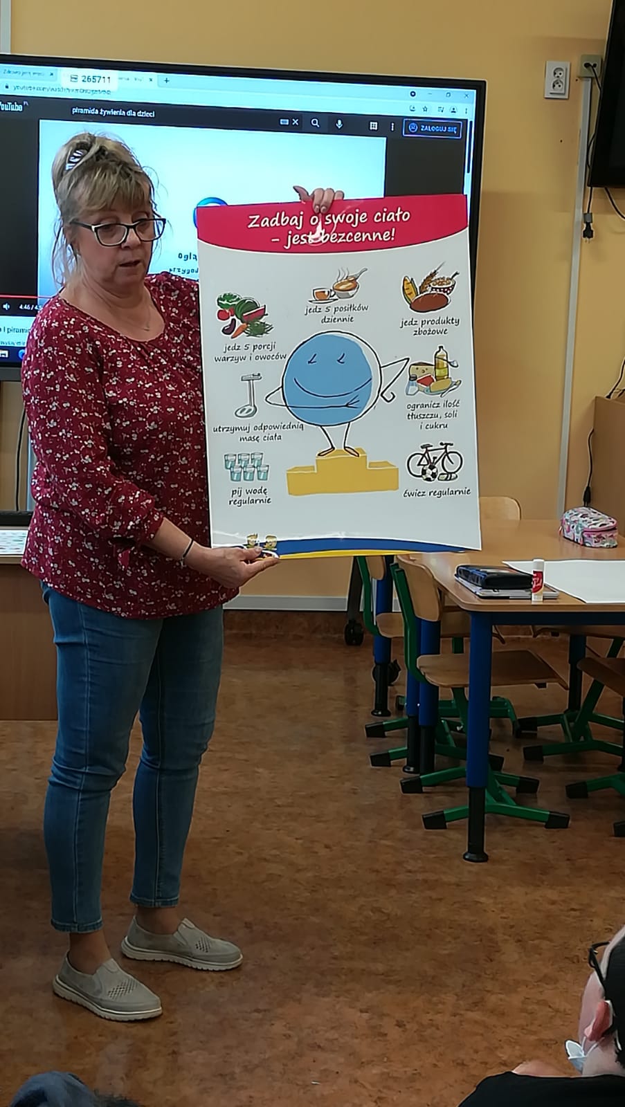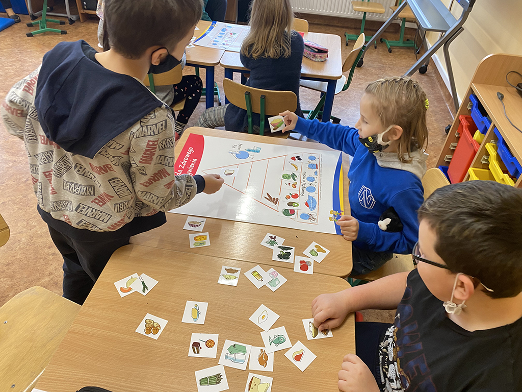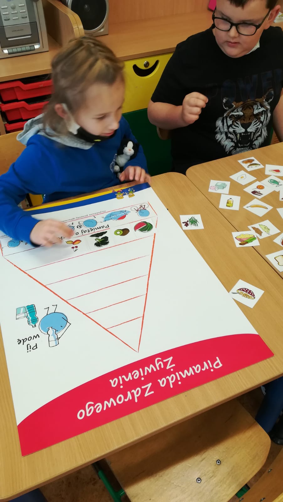 W poniedziałek, 08 listopada w świetlicy szkolnej odbyły się kolejne zajęcia z cyklu „Zdrowo jem, więcej wiem!” Tym razem uczniowie klas drugich zostali wtajemniczeni w nowe pojęcie, jakim jest Piramida Zdrowia. Spotkanie zaczęliśmy od pogadanki na temat roli zdrowego odżywiania w codziennym życiu i jego wpływu na nasz organizm. Rozmawialiśmy o produktach, które powinniśmy spożywać, aby nasza dieta była urozmaicona. Następnie uczniowie zostali zapoznani z budową Piramidy Zdrowia. Omówiono wszystkie jej piętra oraz znaczenie aktywności fizycznej dla naszego zdrowia. Kolejnym etapem zajęć była zabawa edukacyjna „Na które piętro?”, gdzie uczniowie w grupach umieszczali produkty na odpowiednich poziomach piramidy. Dodatkowo zajęcia urozmaiciła piosenka "Mozaikowa piramida żywieniowa", zabawa muzyczno – ruchowa oraz gra planszowa „Piramida zdrowia”.