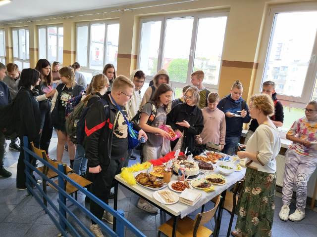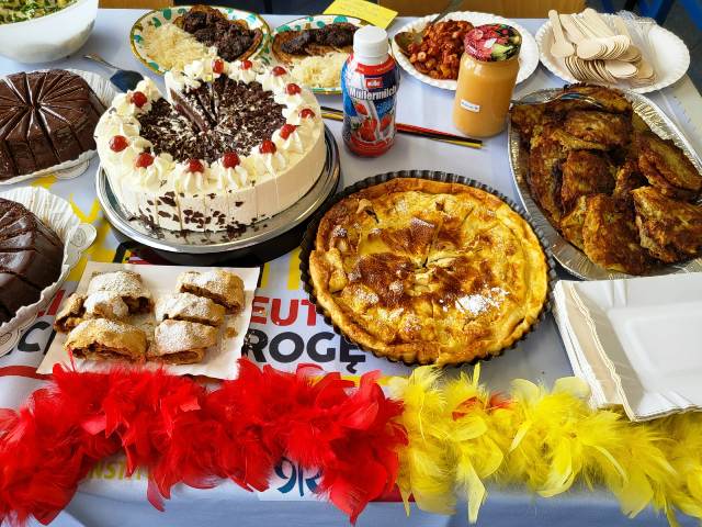 O dania zadbali siódmoklasiści. Większość z nich przygotowała je własnoręcznie. Nie zabrakło tortu Sachera, szwarcwaldzkiego, strucli jabłkowej, sałatki ziemniaczanej czy Currywurstu.
