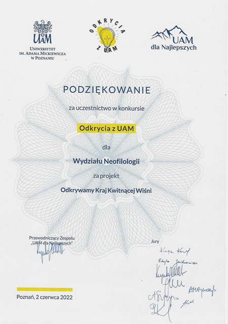 2 czerwca 2022 roku podczas Poznańskiego Festiwalu Nauki i Sztuki w Ogrodzie Botanicznym otrzymaliśmy podziękowanie za projekt „Odkrywamy Kraj Kwitnącej Wiśni" w ramach współpracy z Wydziałem Neofilologii UAM w Poznaniu, a zwłaszcza z Instytutem Orientalistyki. Oceniano innowacyjność, trwałość, znaczenie dla regionu, zasięg i wymiar integracyjny zgłoszonych projektów.