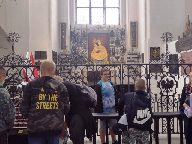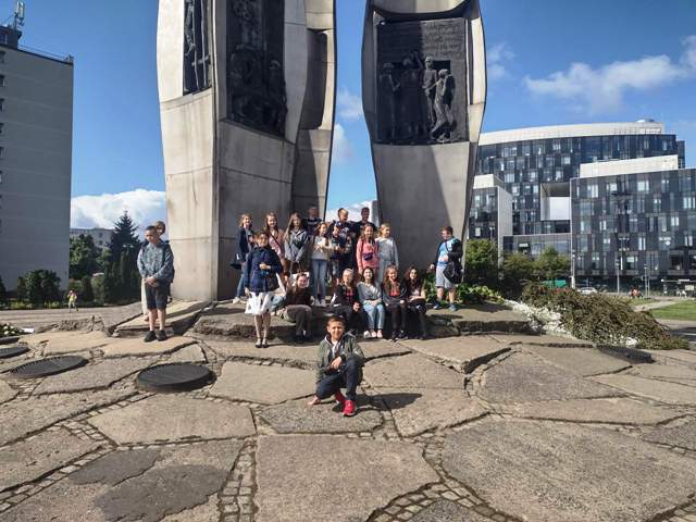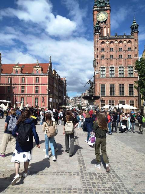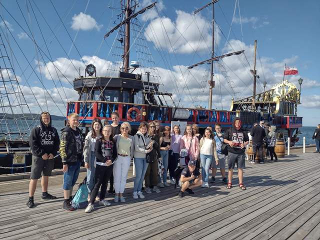 14 czerwca dwudziestu uczniów naszej szkoły wraz z opiekunami w spokojnej atmosferze poranka rozpoczęło zwiedzanie Gdańska od Europejskiego Centrum Solidarności. Następnie ósmoklasiści opowiedzieli młodszym kolegom historię strajków w Stoczni Gdańskiej. Zobaczenie jej na żywo zrobiło na nas ogromne wrażenie. Poczuliśmy się onieśmieleni przez wielkość Bazyliki Mariackiej i piękno znajdujących się w niej obrazów i rzeźb. Na Starówce zobaczyliśmy restaurację „Literacką” (bardzo podobała nam sie jej nazwa), znane z pocztówek statki „Czarna Perła” i „Małgorzata”. Po obejrzeniu posągu Neptuna i szukaniu odpowiedzi na pytanie polonistki o jego greckiego odpowiednika, zgłodnieliśmy i usiedliśmy na jagodzianki, gofry i - jak to nad morzem - lody. Czuliśmy się jak w niebie (wszyscy, dorośli też) podczas pobytu w fabryce słodkości. Żelki, pianki, gumy balonowe, cukierki różnej miary - nic nie umknęło naszym torebkom.