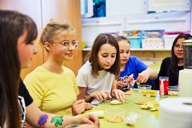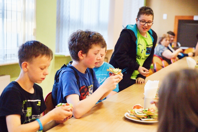 W szkolnej stołówce rodzice przygotowali kolorowe, zdrowe kanapki.