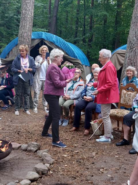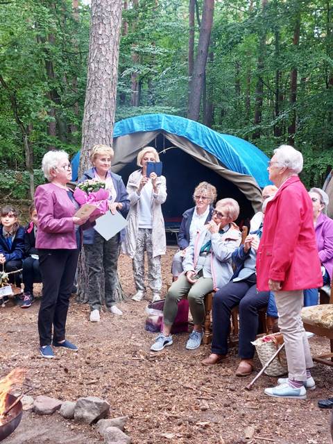 Pani dyrektor otrzymała serdeczne życzenia od dyrekcji, grona pedagogicznego i uczniów szkoły, a także piękne kwiaty. Pani Aleksandra była wyraźnie wzruszona. Pięknie podziękowała za pamięć. Harcerze przygotowali wspaniałe ognisko. Otrzymali od gości mnóstwo słodyczy. To sympatyczne spotkanie było prawdziwa integracją pokoleń!